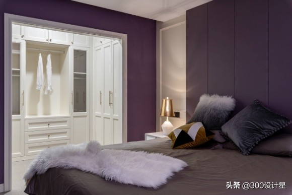 紫色浓郁典雅,白色纯净简洁,不同的颜色搭配在一起碰撞出有层次的美感。主卧凹凸有致的线条与金属光泽述说着空间的轻奢故事,咖色床品与长毛绒用品搭配,彰显业主富有质感的生活。