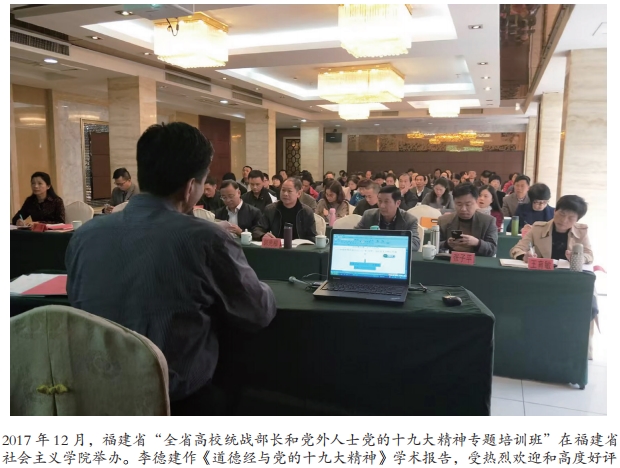 三十余载躬耕不辍,李德建在老子文化的研究、传播与应用领域,结出了累累硕果。他发表学术论文(文章)130余篇,著编《老子研究》《托寄天下·道德之光》等8部著作,其《李德建<道德经>通解》《李德建大道科学演讲录》《李德建道德经智慧溥及讲座》《大道医学十五讲》《大道哲学二十一讲》等音像制品进一步拓展了传播维度。其专著《老子大道科学研究》《老子教育思想的现代实践》被学界与《福建日报》等主流媒体认为具有诸多激动人心的独创观点,将《老子》研究推向了新的高度。